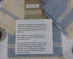 Gladys grew her own cotton to produce these placemats and napkins. She would weave the cotton on a loom. She also grew indigo, which is what she used to "Color" the cotton.