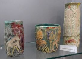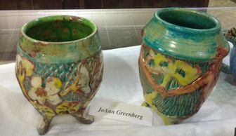 This collection of her pots are highly carved, featuring the relaxed figures, and then RAKU fired. I remember her saying how relaxing it was to carve on clay. Jo Ann was a respected figure in the New Orleans art community, as well as a great supporter of the arts.