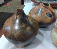 d.2009. "Miss Pat" as she was so affectionately known wrote this about her sagger fired pots, "Before the pots are fired, each pot is polished (or burnished with a stone. The second firing is done inside a clay pot (or sagger pot) with hay and organic material. The pots are then waxed and buffed. The colors and patterns are from the organic material inside the sagger."