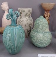 I was introduced to clay and pottery making at an early age, from both a mother who was artistic and an uncle who made molded pottery that he decorated. When I went to a liberal arts college in Pennsylvania, I had a wonderful experience in the Ceramics classes, which brought wheel throwing into my life. Since 1970, I have dedicated much of my time and efforts in the craft of making hand-thrown pots. My work has centered around functionality and quality craftsmanship. I have participated in craft shows, traveling to many eastern and southern states making connections with galleries and crafts shops, some which carried my work for many years. Along with my husband, an artist in his own realm of painting and print making, we have worked collaboratively on many of the more involved and intricately expressive clay pieces. Being a potter has taught me to respect the unexpected surprises that come along as part of the process.