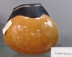 This is a gourd with horse hair woven into the top. Angela was a member of the Mississippi Artist Guild. She always had a horticultural interest, and was a self taught artist. She was inspired by the Native Americans of Natchitoches. Angela admitted that pine weaving was too rough on her hands, therefore found horse hair to weave, which was easier on the hands.
