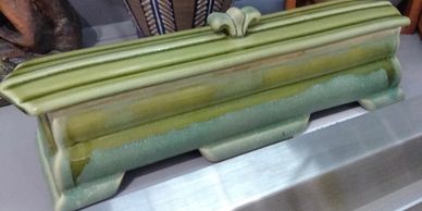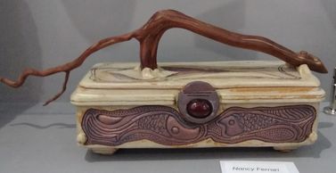 The designs of Mark's clay boxes are inspired by New Orleans architecture, with geometric and Neo-classical elements. Mark's interest is in the clay as a material, and in the process of forming, glazing and firing. He says that he works hard at becoming a better potter, and that there's the excitement of progression in the work.