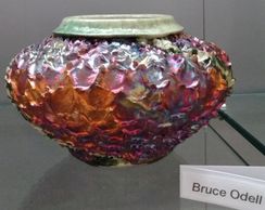 After throwing a pot, Bruce textures the cylinder, and then expands the shape from within. Most of these textures mysteriously seem to relate to nature. And then he raku fires the pot. "Raku" is an ancient Japanese fast-firing technique where, in about 30 minutes, the pot is fired to 2000 degrees and then cooled in the open air. The glaze Bruce uses becomes a molten liquid, and then he sprays the pot with flammable liquid, and the pot bursts into flames. Sawdust and air paint the piece into a rainbow of metallic colors. Then, the pot is plunged into a barrel of water, and the color is a frozen testimony to the trials of each, fire, air and water.