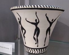 In May of 1980, Rocky earned a Bachelor of Fine Arts from Louisiana State University, with a concentration in Ceramics. She did teach art for 15 years, but later became a full time potter. She loves simple vessel forms, and is particularly fond of strong color contrasts. This vessel is from her "Dance Series." Her silhouette of dancers are painted to communicate joy.